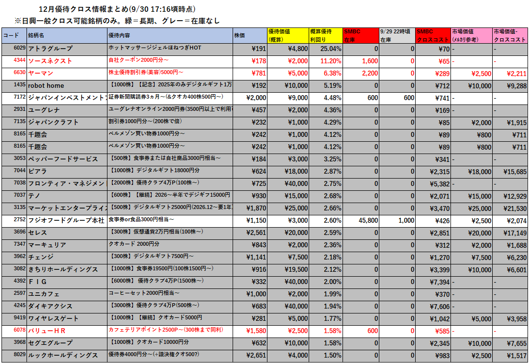 日興証券で優待クロスできる銘柄の情報を一覧でまとめています。