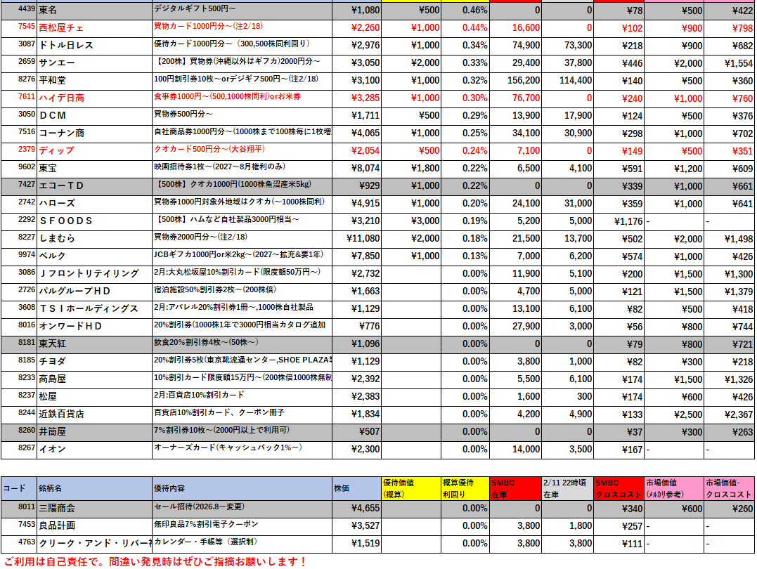 【2月優待】日興:優待クロス銘柄一覧!利回り・一般在庫・コストを定期更新 クロス在庫 2024.03.142026.02.12スポンサーリンク 日興証券でクロスできる2月優待銘柄情報日興証券で優待クロスできる2月優待銘柄の情報を一覧でまとめています。この表で分かること一般信用売り在庫の数、かかるコストや利回り、市場価値が確認できます。★表の見方解説 ★注目在庫抜粋★1月 ★2月 ★3月 ★4月 ★5月★優待新設・変更情報ざっくりまとめクリックで拡大( ˙꒳˙ ) ↓文字検索もできるPDFはこちら0212時点2月クロスダウンロードお得な使い方・詳細は2月個別記事▶全部見るココイチなど1年間10%オフ![PR]飲食店が1年間10%オフになる パスポート付きのファンブック発売!【CoCo壱番屋】 2027.1まで何度でも10%オフ! Amazon/楽天 【上島珈琲店】(2/12発売) 2027.2まで何度でも10%オフ! Amazon/楽天 【すし銚子丸】 2027.4まで月1回合計12回まで10%オフ! amazon/楽天 株主優待も併用可! 買うなら早い方がお得です 読んでいただきありがとうございました! 当ブログの情報は時期や店舗により異なる可能性がございますのでご注意ください。 ご指摘や追加情報などございましたら問い合わせフォームよりご連絡いただけると幸いです!