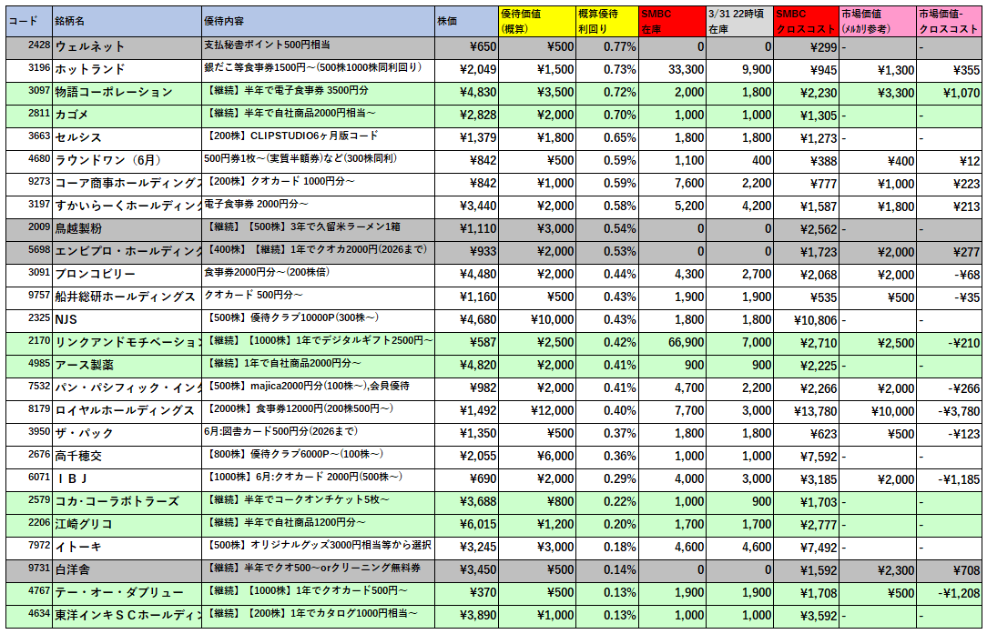 日興証券で優待クロスできる銘柄の情報を一覧でまとめています。