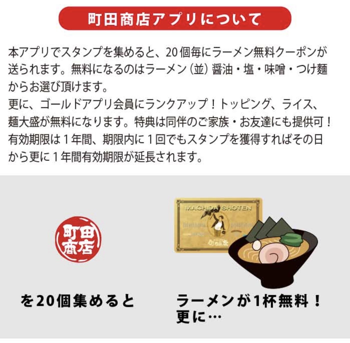 ・「来店」で1個「完まく」で1個、計2個のスタンプが1回の来店で貯まり、スタンプ20個でラーメン1杯無料。更にゴールドアプリ会員にランクアップし、1年間トッピングorライスor麺大盛りが本人も同伴者も無料に!