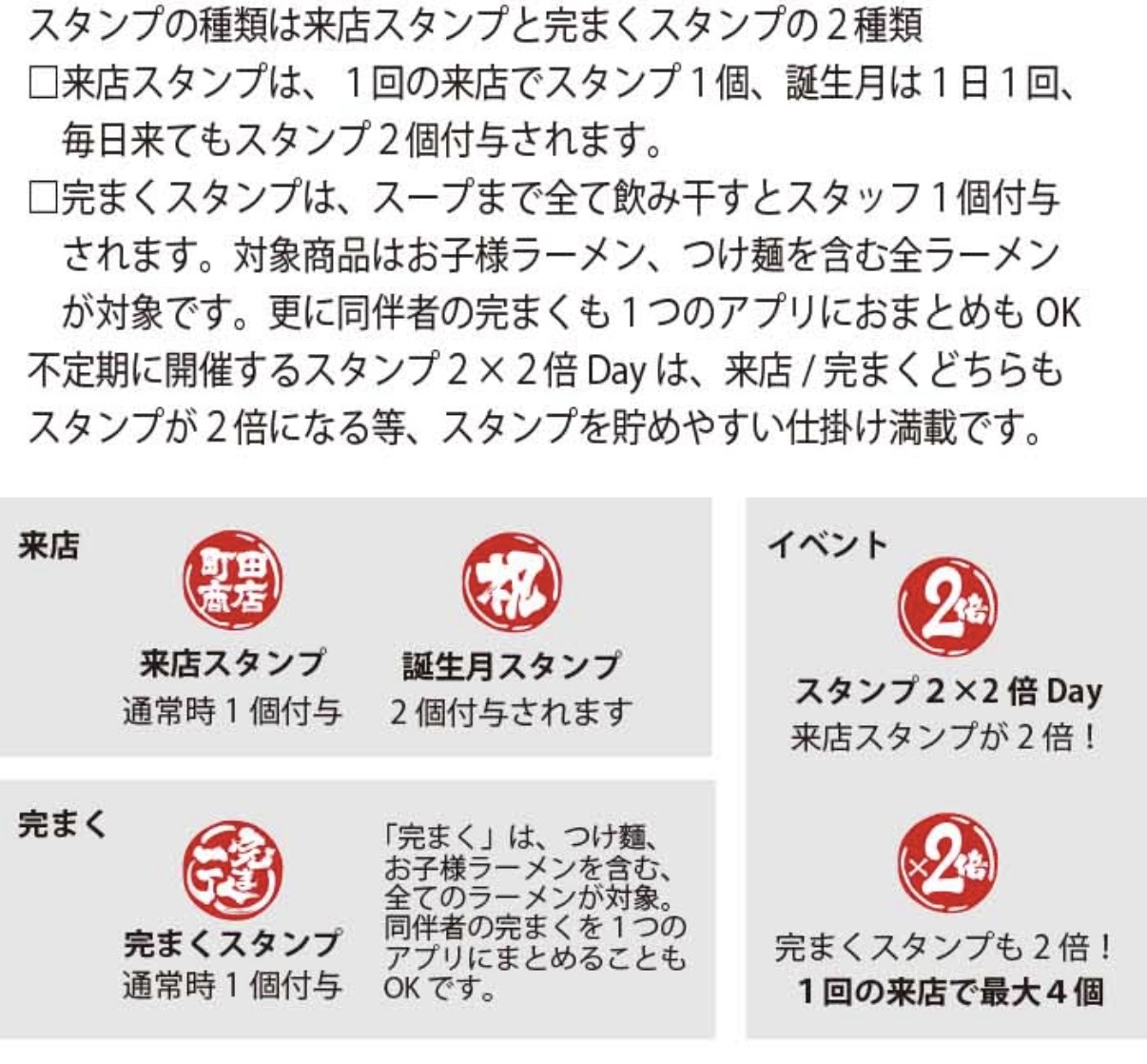 町田商店公式アプリの新完まくアプリでは、「来店」「完まく」(ラーメンをスープまで飲み干すこと)を条件にスタンプが貰えて貯めるとラーメン1杯無料などの特典があります。