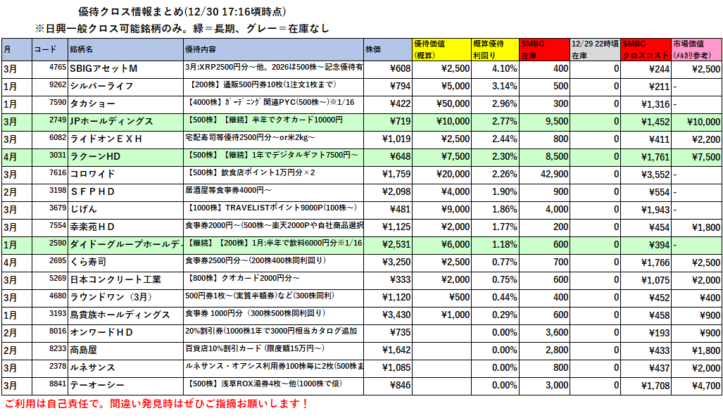 日興証券で優待クロス(一般売り)できる優待銘柄の情報を一覧でまとめています。